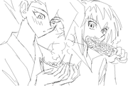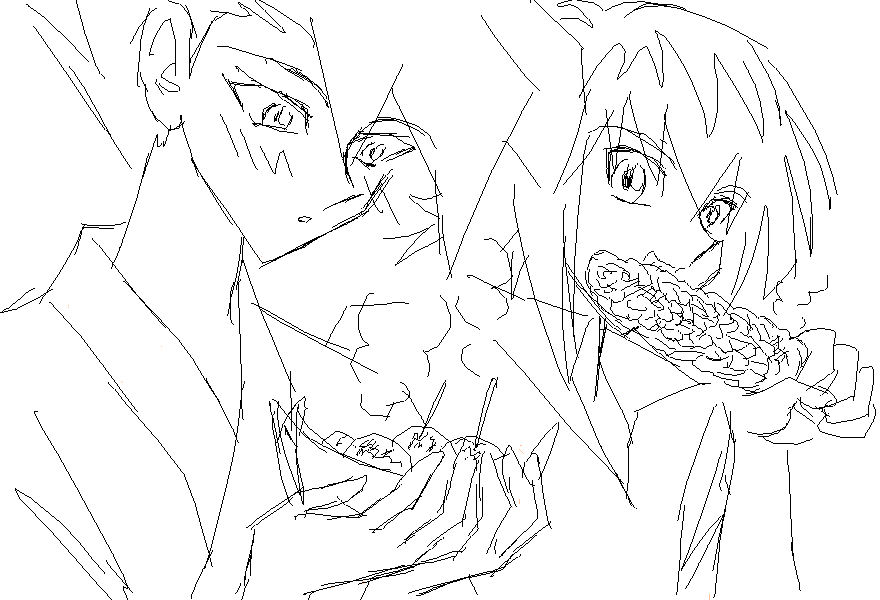 日記絵は夜店にて、たこ焼き初体験の万丈目さんと、焼きトウモロコシを齧る十代クン。
