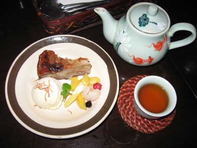 バナナケーキとココナッツアイスに蓮の葉茶。お腹も気持ちも満たされたディナーでした。また行きたい!