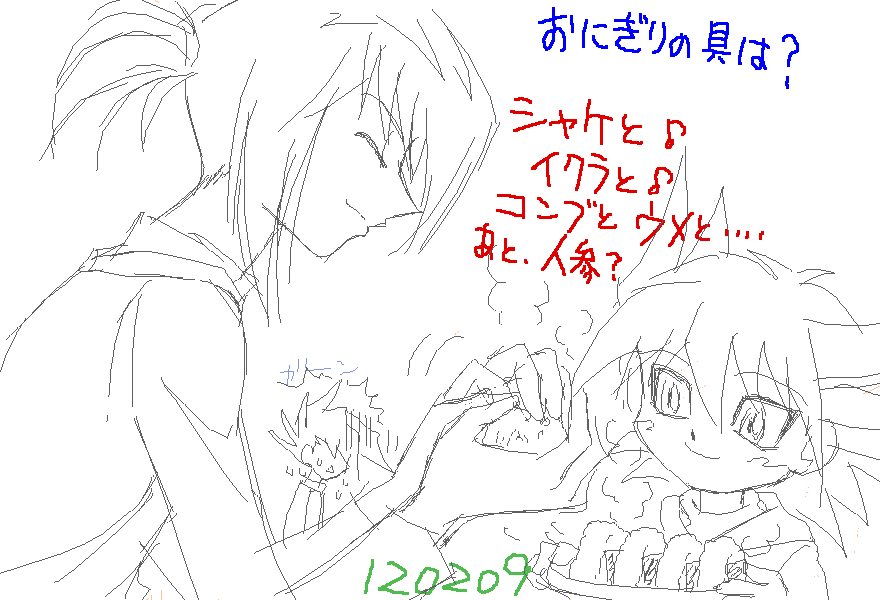 で。自分の落書ではちっとも美味しそうじゃなくて残念な十代とうさんのオニギリ。