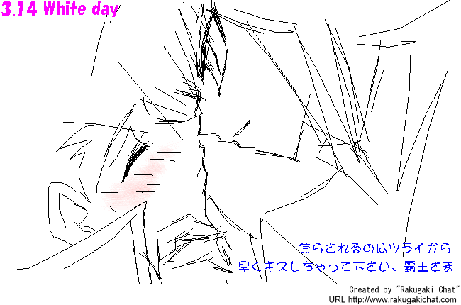 今年こそは十万でホワイトデーなネタを描きたいなと思っていましたが。思っていましたが…やっぱ無理みたいです。どっかにネタ満載の四次元ポッケとか無いかなぁ。