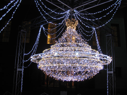 右:中之島の大阪市役所前にあった、謎の光る物体。宙吊りのツリー?