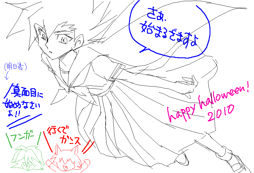 トップ絵が仕上りませぬ。ハロウィンの仮装でいく予定を普段の制服姿に変えたら、なんだか地味な感じになりそう。カラフルなイラストを描ける人ってイイなぁ…と思います。自分にはとても無理だから憧れ。